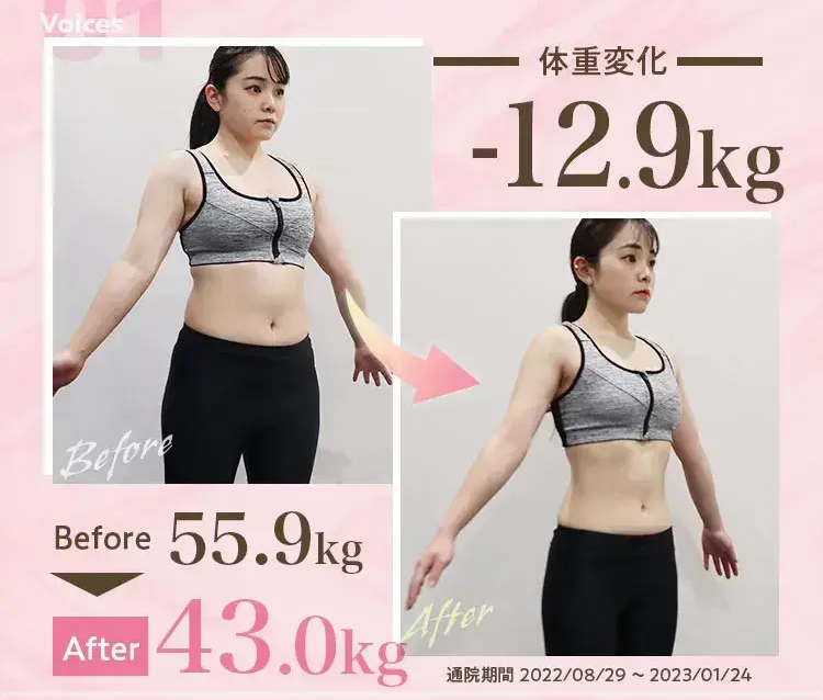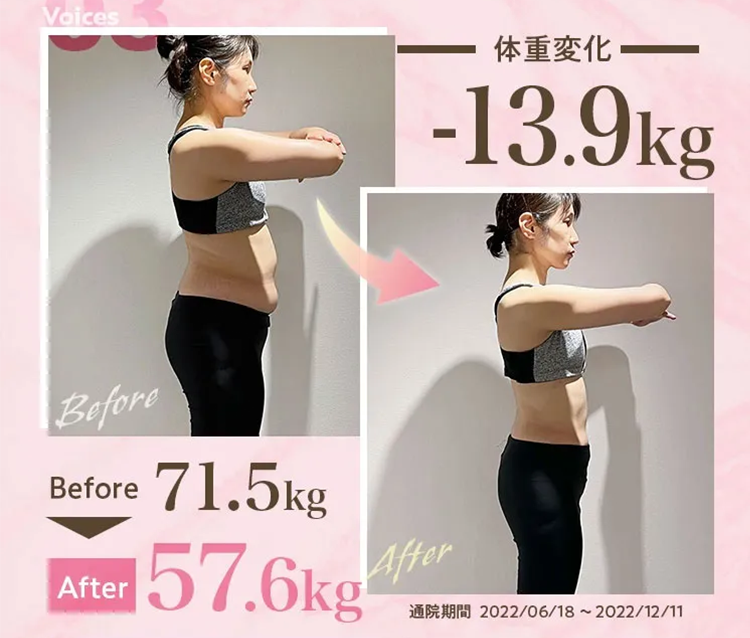 ※最終体重測定2023/02/01~2023/07/31で薬なし/食事指導なしを除く、3ヶ月コース(ビューティー/リピート除く)の契約終了者が対象※効果には個人差があります